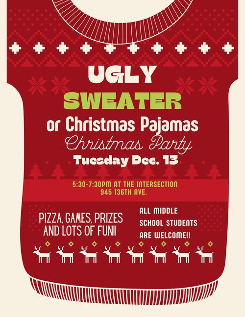 Join us for our Annual Christmas Party, Tuesday, Dec 6th from 5:30pm-7:30pm at the Intersection (945 136th Ave. Holland, MI 49424). All Middle School Students are welcome, we will have pizza, games, and lots of prizes so make sure you are there! If you have an ugly sweater or Christmas Pajamas, make sure you wear them to the party, there will be a contest for best outfit! Questions send us an email.