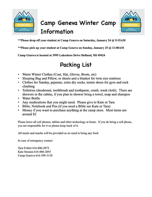 Drop off and Pick up will be at Camp Geneva (3995 Lakeshore Dr. N Holland, MI 49424)